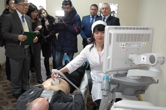 2月13日,角大使はハルキウ州ロゾバ市を訪問し,平成26年度草の根・人間の安全保障無償資金協力「ロゾバ市立病院における医療機材改善計画」の引渡式を実施するとともに,ジドコフ・ロゾバ市長と会談しました。本案件では,被供与団体となるNGO「地域医療基金」を通じ,ロゾバ市立病院に対して東芝製の超音波診断装置を供与しました。