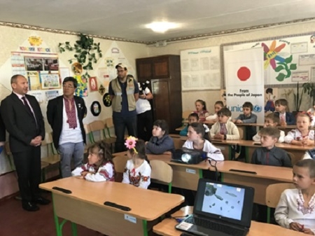 ルハンスク州にあるヴルビウカ地区学校はコンタクト・ラインからも近く,砲撃などの被害を受けてきました。日本国政府は,UNICEFを通じ,子供達の教育環境の改善や精神面でのケアに焦点をあて,体育で使用する機材の供与,地雷の危険性やストレス緩和に関するワークショップのための教材や机・椅子の供与等を行ってきました。今回の視察では,ヴィシヴァンカを着た生徒たちからの歓迎を受けるとともに,生徒たちと一緒に桜の植樹を行い,関係者からは感謝の言葉が述べられました。